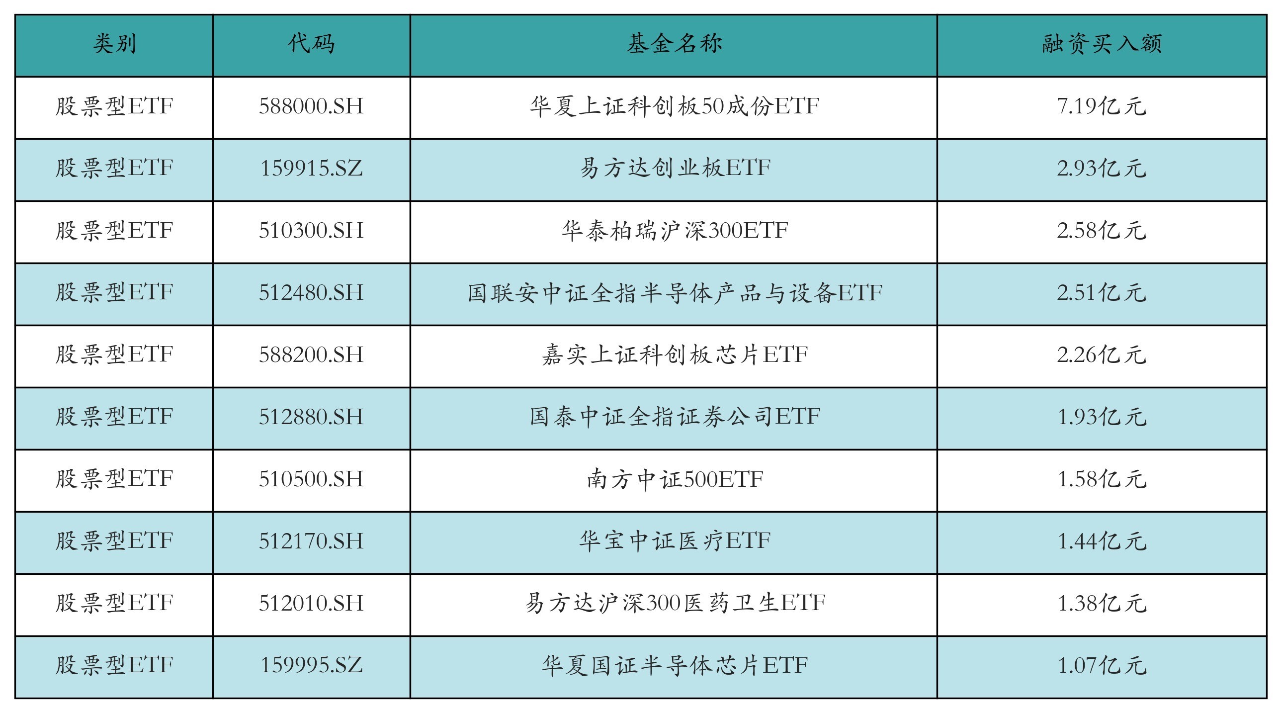 昨日股票型ETF融资买入额最高的3支ETF及其买入金额分别为:华夏上证科创板50成份ETF(7.19亿元)、易方达创业板ETF(2.93亿元)、华泰柏瑞沪深300ETF(2.58亿元)。融资买入额前10详情见下表: