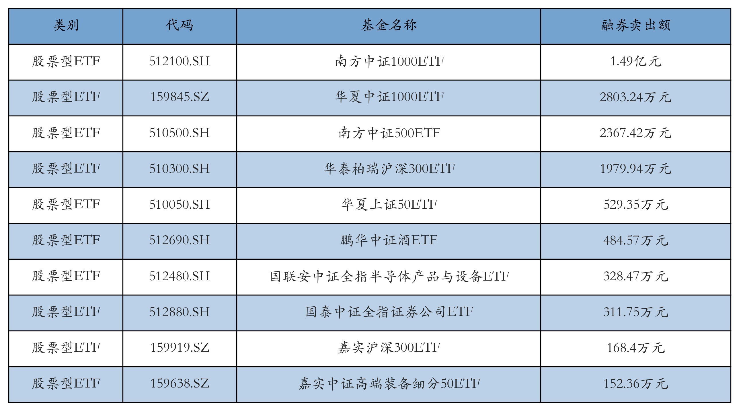 昨日股票型ETF融资卖出额最高的3支ETF及其卖出金额分别为:南方中证1000ETF(1.49亿元)、华夏中证1000ETF(2803.24万元)、南方中证500ETF(2367.42万元)。融券卖出额前10详情见下表: