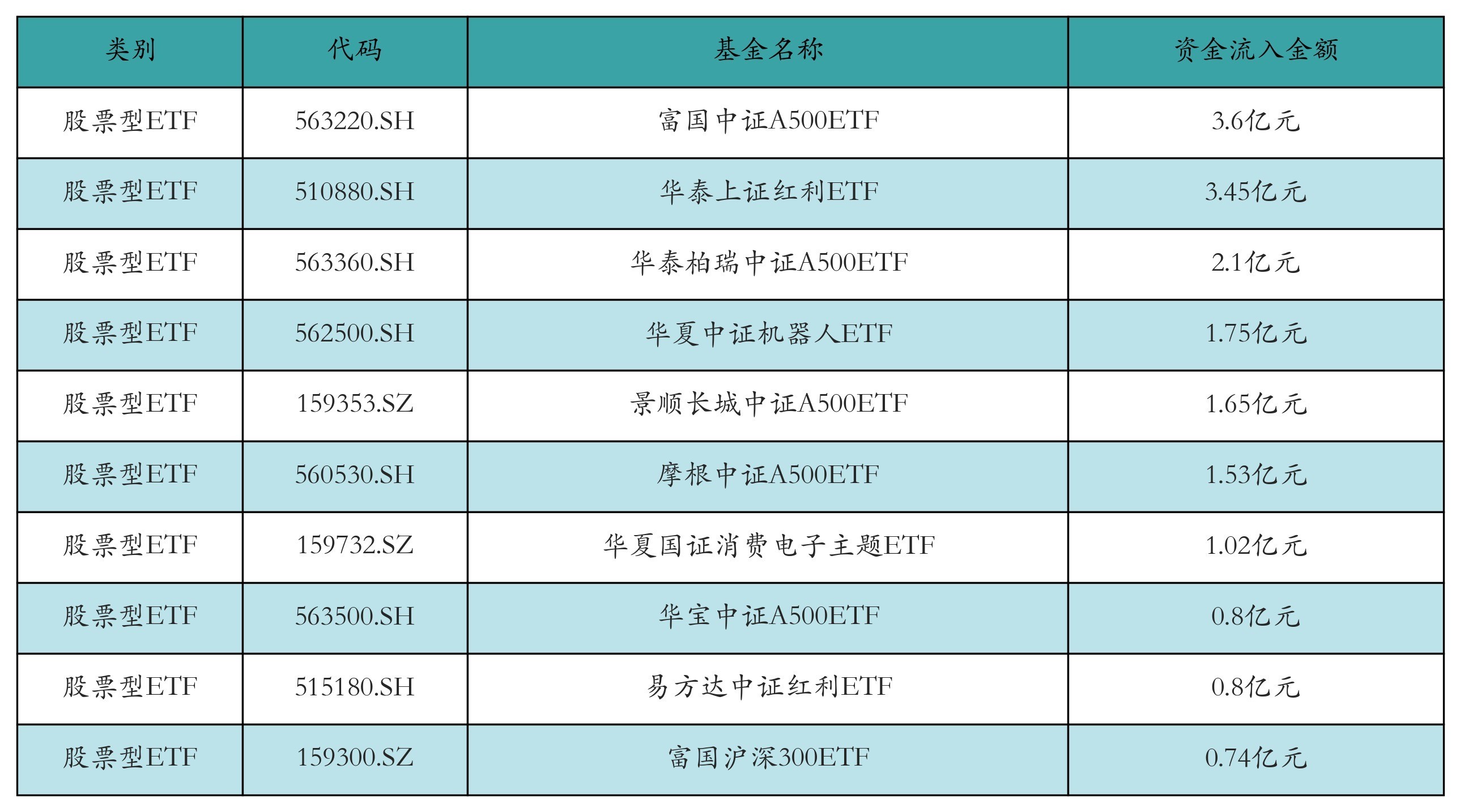 昨日股票型ETF资金流入最多的3支ETF及其流入金额分别为:富国中证A500ETF(流入3.6亿元)、华泰上证红利ETF(流入3.45亿元)、华泰柏瑞中证A500ETF(流入2.1亿元)。资金流入前10详情见下表: