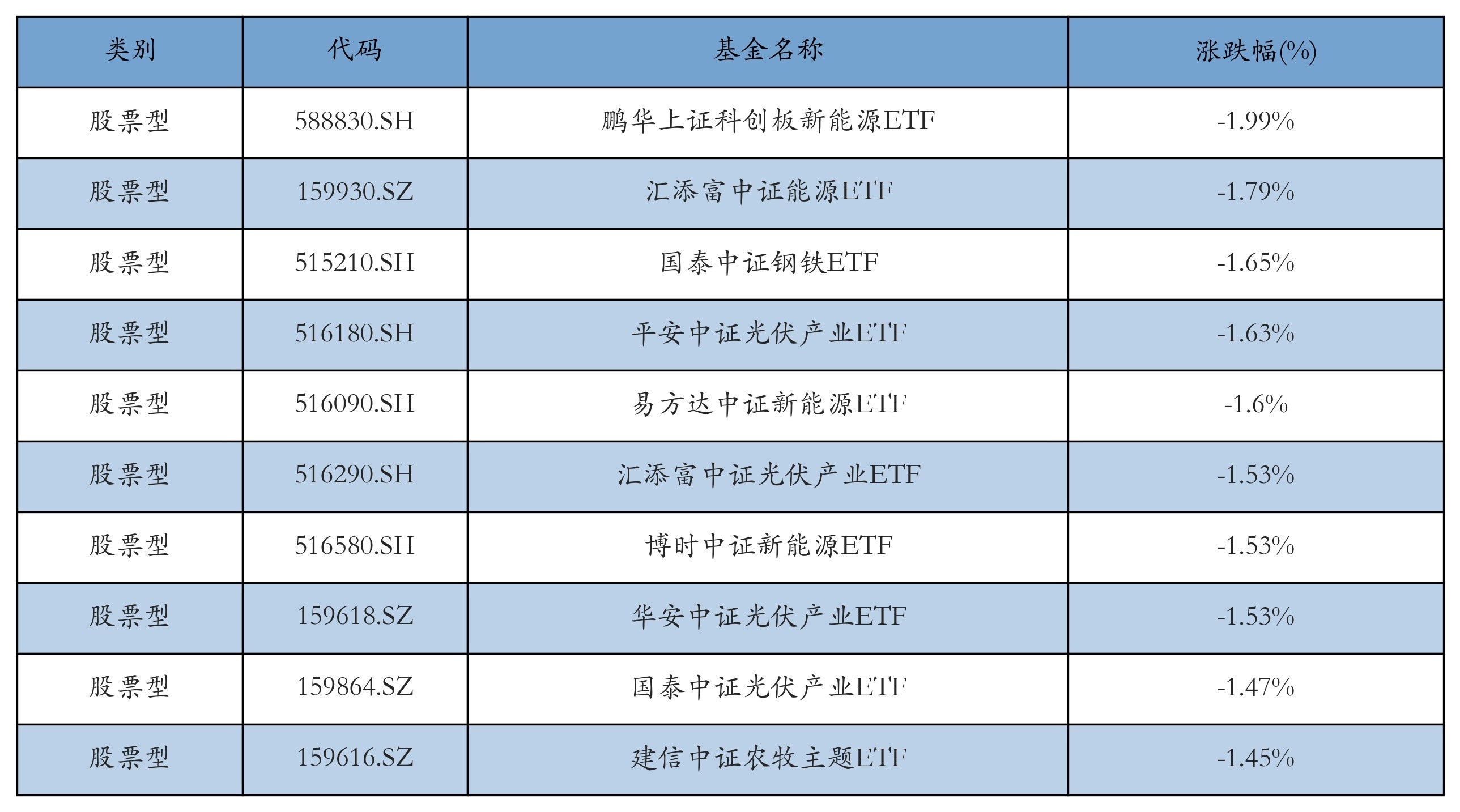 昨日股票型ETF跌幅最大的3支ETF及其收益率分别为:鹏华上证科创板新能源ETF(-1.99%)、汇添富中证能源ETF(-1.79%)、国泰中证钢铁ETF(-1.65%)。跌幅前10详情见下表: