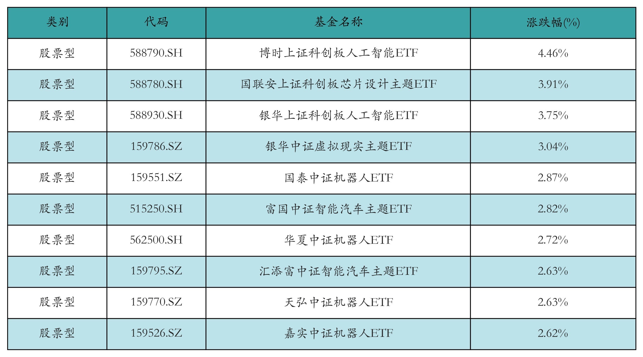昨日股票型ETF涨幅最高的3支ETF及其收益率分别为:博时上证科创板人工智能ETF(4.46%)、国联安上证科创板芯片设计主题ETF(3.91%)、银华上证科创板人工智能ETF(3.75%)。涨幅前10详情见下表: