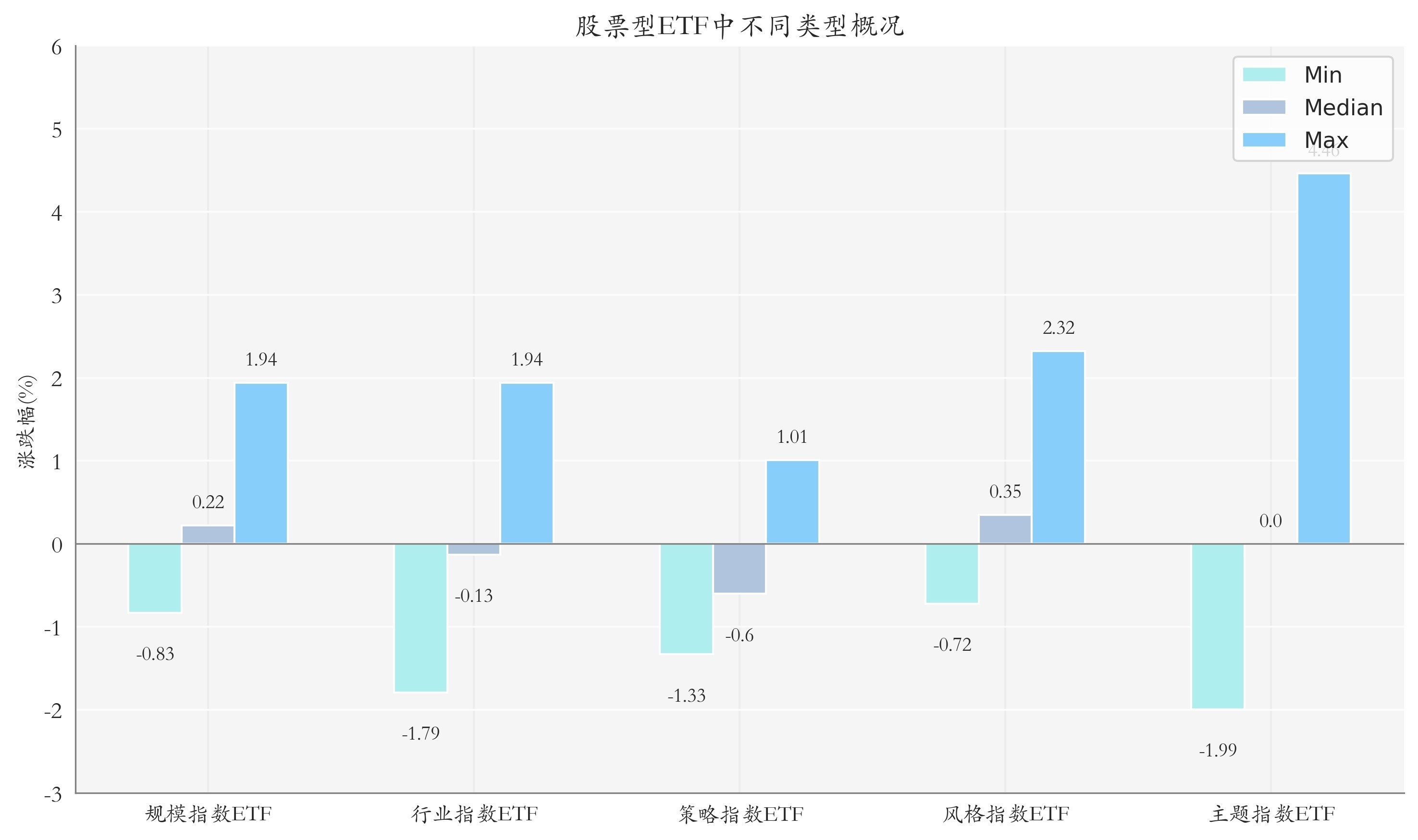 二、ETF市场表现1、股票型ETF整体市场表现昨日股票型ETF收益率中位数为0.1%。其中按照不同分类,规模指数ETF中华夏上证科创板200ETF收益率最高,为1.94%;行业指数ETF中广发中证全指信息技术ETF收益率最高,为1.94%;策略指数ETF中建信深证基本面60ETF收益率最高,为1.01%;风格指数ETF中广发上证科创板成长ETF收益率最高,为2.32%;主题指数ETF中博时上证科创板人工智能ETF收益率最高,为4.46%。
