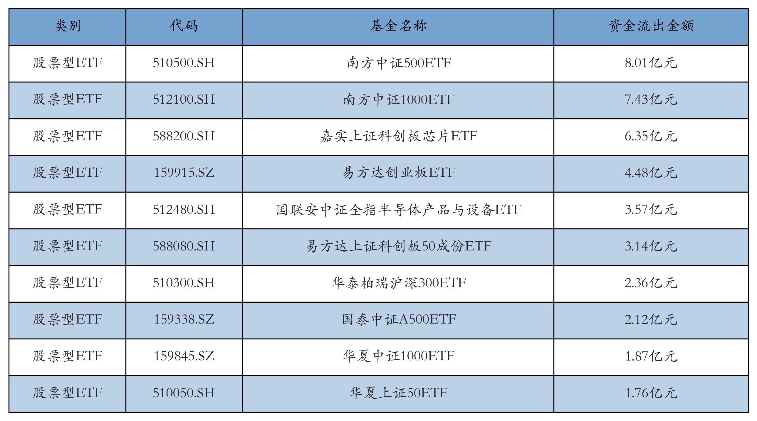 昨日股票型ETF资金流出最多的3支ETF及其流出金额分别为:南方中证500ETF(流出8.01亿元)、南方中证1000ETF(流出7.43亿元)、嘉实上证科创板芯片ETF(流出6.35亿元)。资金流出前10详情见下表: